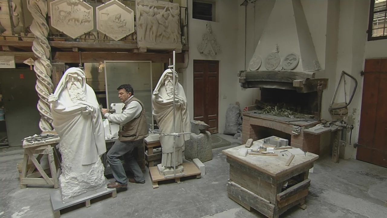 Filippos alter Freund ist mittlerweile zum angesehensten Bildhauer von Florenz geworden. Für die Fassade und den Campanile des Doms hat er Statuen geschaffen, die die Bildhauerei vollkommen verändert haben. Sie gehören zu den kostbarsten Kunstwerken des Doms. Um sie vor Umwelteinflüssen zu schützen, stehen am Turm heute Kopien - entstanden in der Bildhauer-Werkstatt der Dombauhütte. Hier arbeiten die Meister noch heute genau so wie Donatello selbst vor über einem halben Jahrtausend.