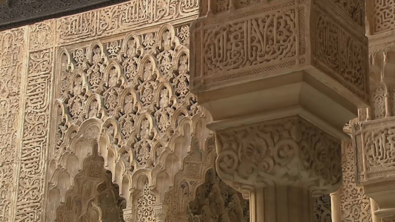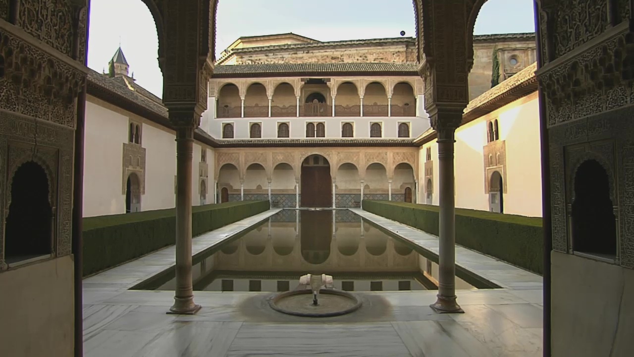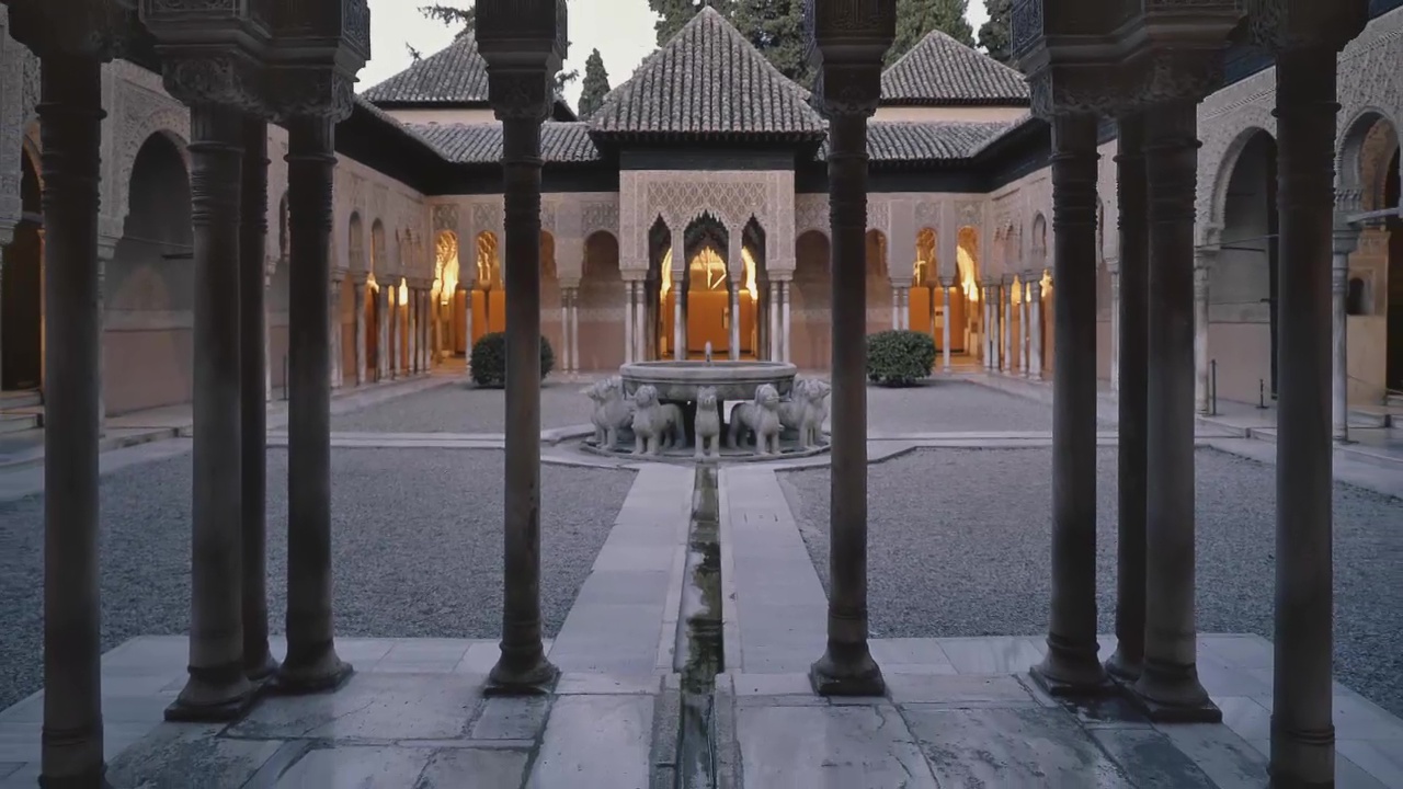 Here, the Acequia Real leads directly through the Generalife Palace: a synthesis of functionality and aesthetics. The water stairway – a quirky feature that’s again functional: it’s’s also a conduit. The aqueduct that supplies the Alhambra is located at the external fortification ring – a weak spot in the event of an attack, the fortress’ Achilles heel. The Palace of the Lions was referred to by the Nasrids as the “Garden of Happiness”. Here, too, water was the focal point. The courtyard is divided by four channels. They might symbolise the four rivers of paradise – described in the Koran as streams of water, milk, wine and honey. The conduits were once bordered by orange trees – in paradise too, fruits and shade also await the god-fearing. So the “Garden of Happiness” provides a foretaste of paradise in the here and now. All the water channels run to the middle, the fountain of the lions.