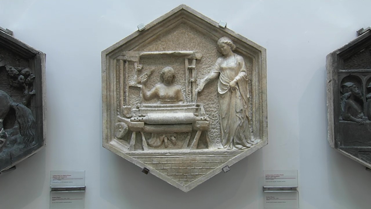 Pisano devotes an individual medallion to the invention of weaving – a nod to the guild of wool magnates, which had after all commissioned the project. In the upper levels, the panels are not octagonal, but diamond-shaped. They portray allegories of the planets and on the north side the seven sacraments, some of them the work of Andrea’s assistant Maso di Banco. Pisano’s reliefs display a spatial depth similar to that found in paintings by Giotto – so similar in fact that some wonder if the designs were not actually the work of Giotto himself. On the eastern side on the upper level the virtues, and finally the pinnacle of human inventiveness: the Seven Liberal Arts – symbolically portrayed such as here for example, Grammar. Andrea Pisano died after building two new sections of the tower. His successor Francesco Talenti eventually completed it in 1359. He had again added three sections – this time with large Gothic windows and dispensing with any further figural ornamentation. This way, he gave the tower its elegant airiness.