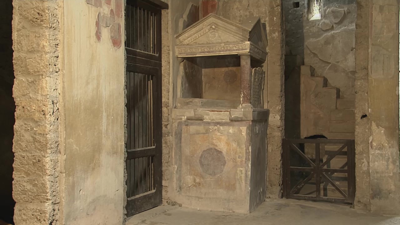 The massive front doors were decorated with bronze fittings – lion heads were especially popular. But, typically, the ancient Romans were also fond of winged figures from the culture of Babylon - or present-day Iraq – a good three thousand kilometers away from Pompeii. The Roman Empire was a globalized world – and a world full of gods. They were omnipresent: every house had at least one altar representing gods, whether it was the mighty gods of Mt. Olympus, or the Lares – the ancestor gods and household guardians.