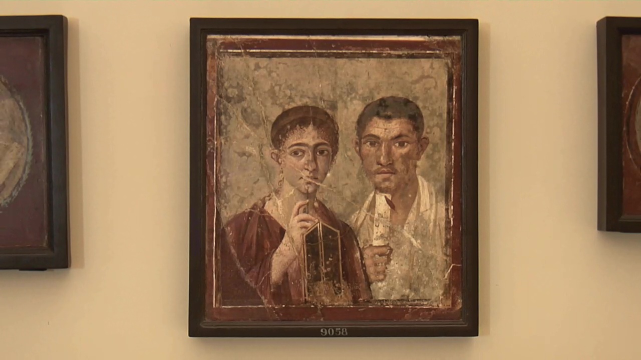 However, the portrait gives the impression that the painter may have enjoyed exposing the couple’s unease. He gave Terentius Neo the typical features of the Samnites, a tribe that had migrated to Pompeii from the mountains. Much as the husband and wife are trying to look like cultivated intellectuals, Terentius Neo was no aristocrat, but a nouveau riche baker.