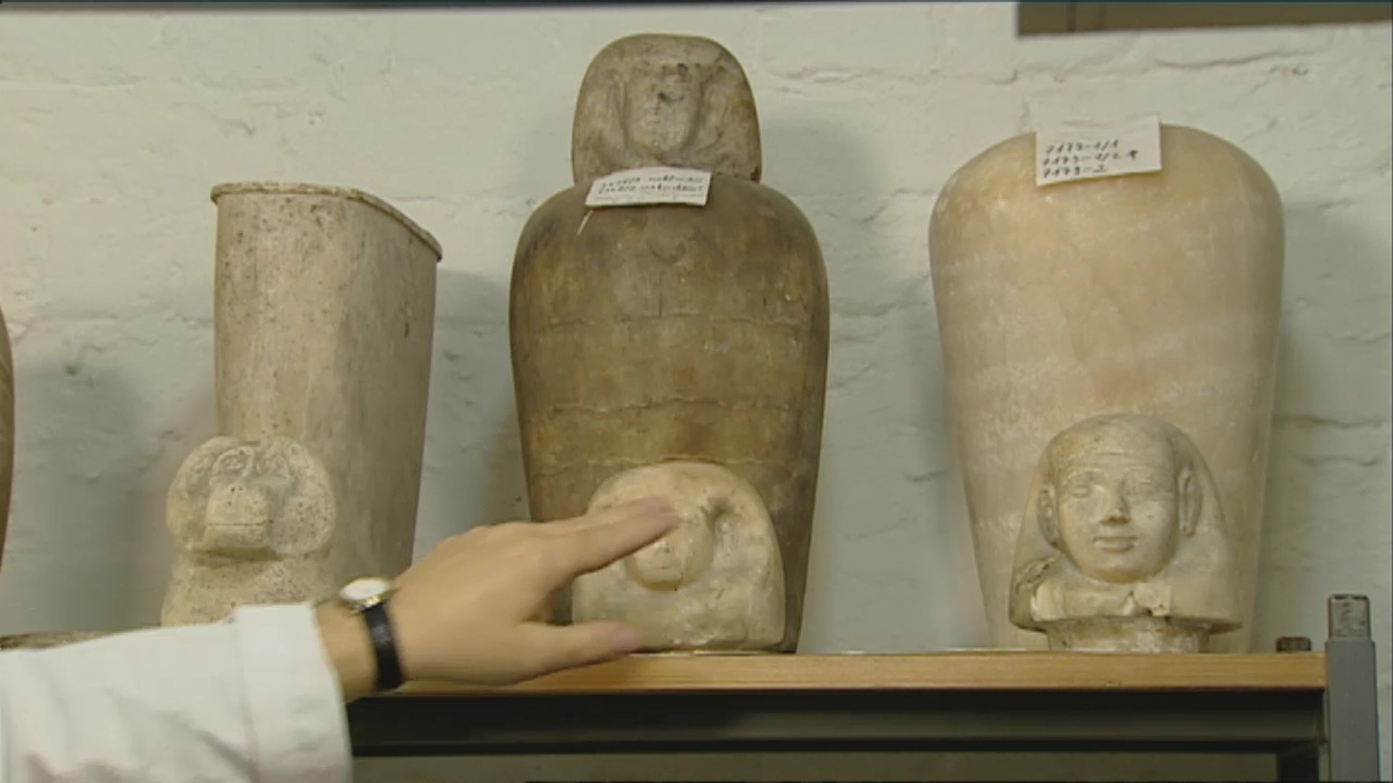 “The canopic jars were an important part of the funerary rites. During mummification, the deceased’s embalmed viscera were removed and put in these jars. After the top was put on, the jar was placed in the tomb with the deceased.”