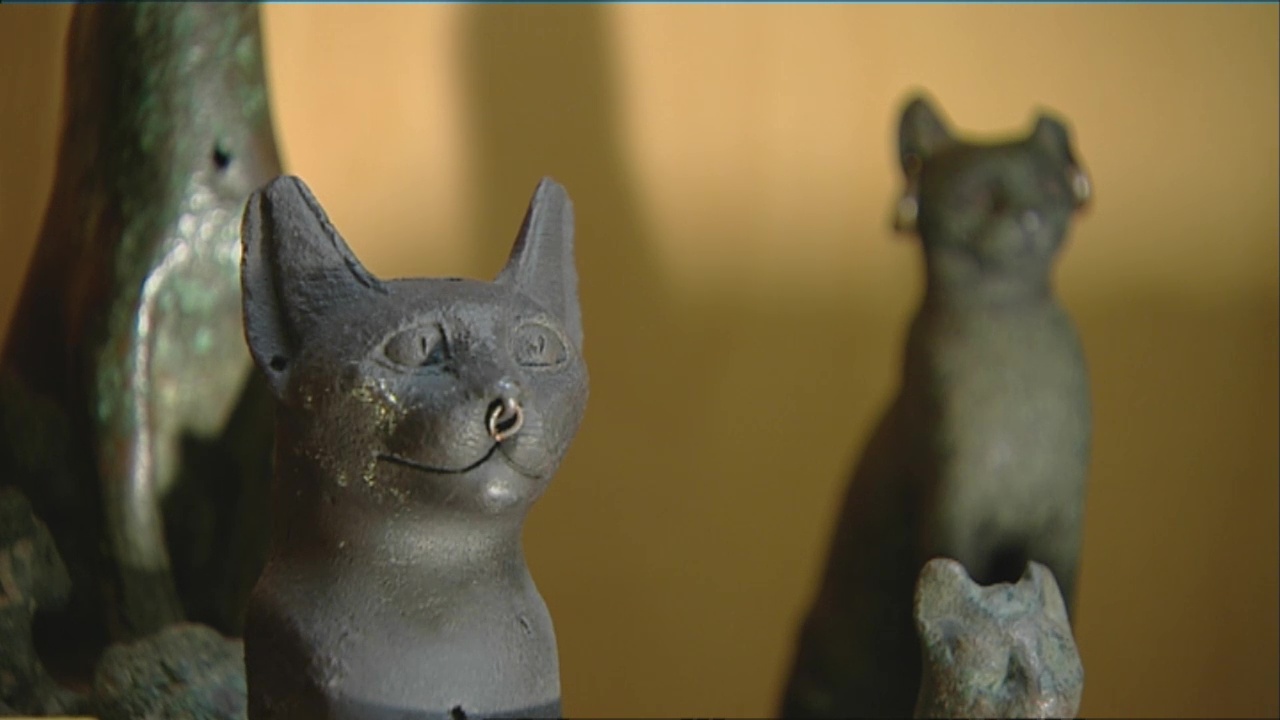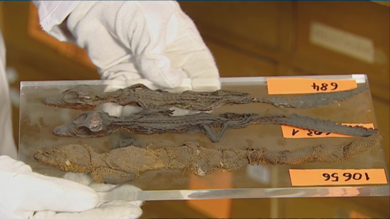 “In addition to a large number of human mummies, the Egyptian Museum also has a lot of animal mummies. For instance, this little cat, where even the ears and the eyes have been perfectly formed. There are also mummies of crocodiles. The crocodile mummies can be wrapped up and they look like this. But there are also unwrapped ones that look like this. The animal mummies represent personifications of Egyptian gods.”