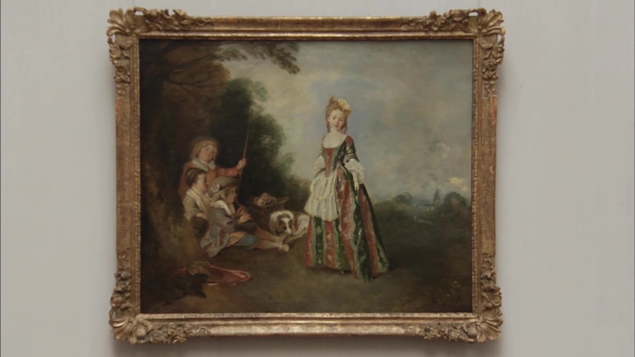 The painting is rectangular, but it used to be round. One can see where parts were added. Perhaps it was changed to fit the decor of a certain room, because paintings like this were considered part of a palace's decoration. Architecture, interior design, sculptures, paintings all had to harmonise -- carefully composed to create a complete Rococo experience. Pictures were often integrated into wall panelling, as we see here in the music room at Sanssouci in Potsdam, the summer residence of Prussia's most famous king, Frederick the Great. Frederick loved all things French. As crown prince and young monarch, he collected contemporary French paintings. Fifteen Watteaus can still be seen in the royal palaces in Berlin and Potsdam, four more are in the Gemäldegalerie.